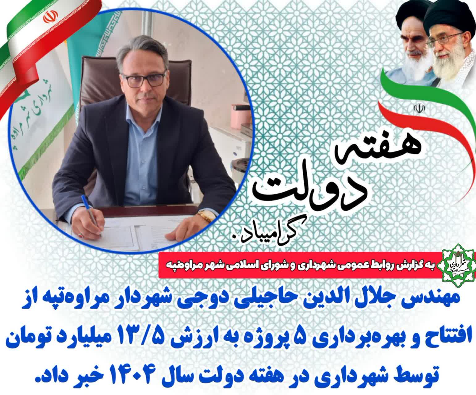 شهردار مراوهتپه از افتتاح و بهرهبرداری از پنج پروژه عمرانی، خدماتی و اقتصادی به ارزش ۱۳/۵ میلیارد تومان توسط شهرداری مراوهتپه در هفته دولت سال ۱۴۰۴ خبر داد