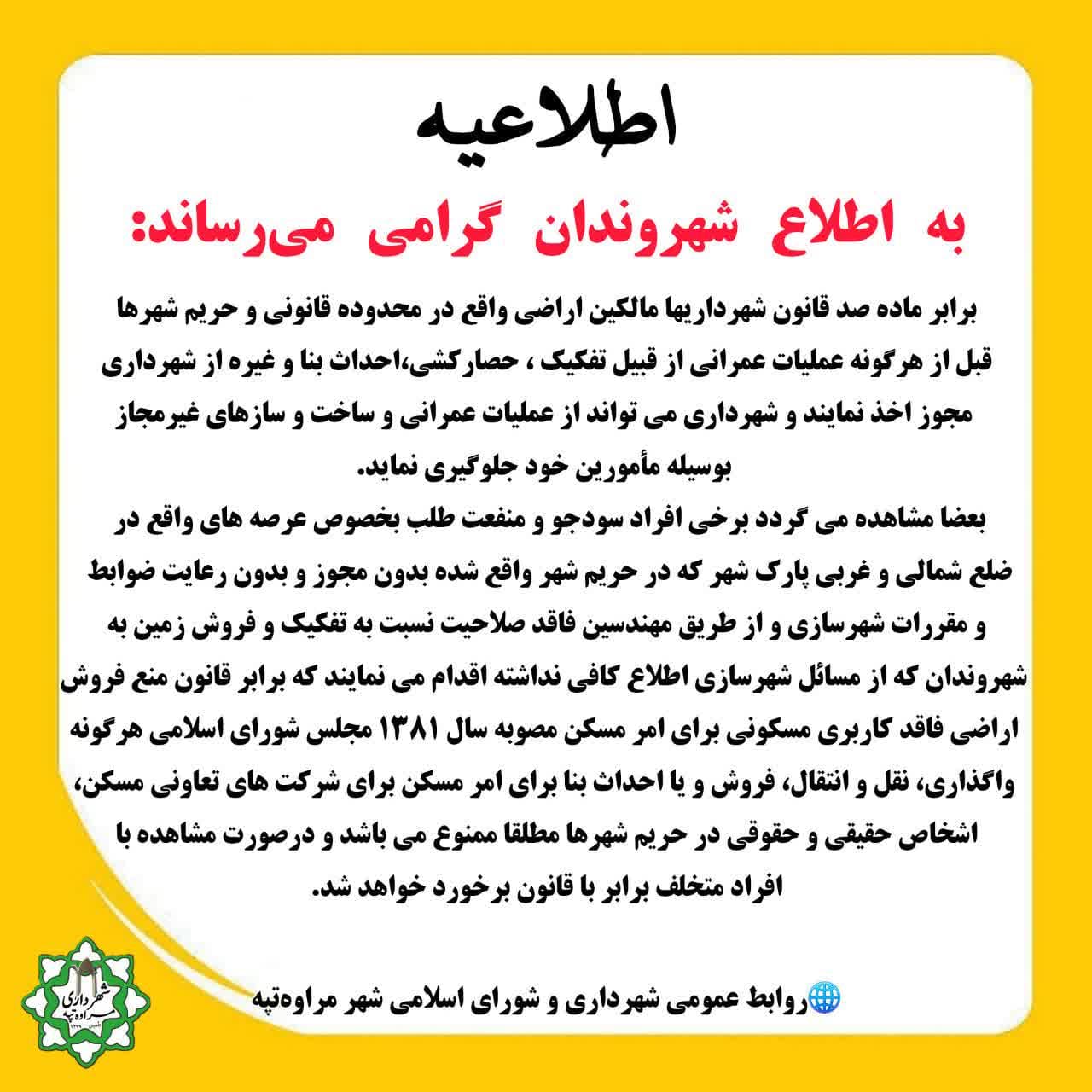 بعضا مشاهده می گردد برخی افراد سودجو و منفعت طلب بخصوص عرصه های واقع در ضلع شمالی و غربی پارک شهر که در حریم شهر واقع شده بدون مجوز و بدون رعایت ضوابط و مقررات شهرسازی و از طریق مهندسین فاقد صلاحیت نسبت به تفکیک و فروش زمین به شهروندان که از مسائل شهرسازی اطلاع کافی نداشته اقدام می نمایند که برابر قانون منع فروش اراضی فاقد کاربری مسکونی برای امر مسکن مصوبه سال ۱۳۸۱ مجلس شورای اسلامی هرگونه واگذاری، نقل و انتقال، فروش و یا احداث بنا برای امر مسکن برای شرکت های تعاونی مسکن،اشخاص حقیقی و حقوقی در حریم شهرها مطلقا ممنوع می باشد و درصورت مشاهده با افراد متخلف برابر با قانون برخورد خواهد شد.