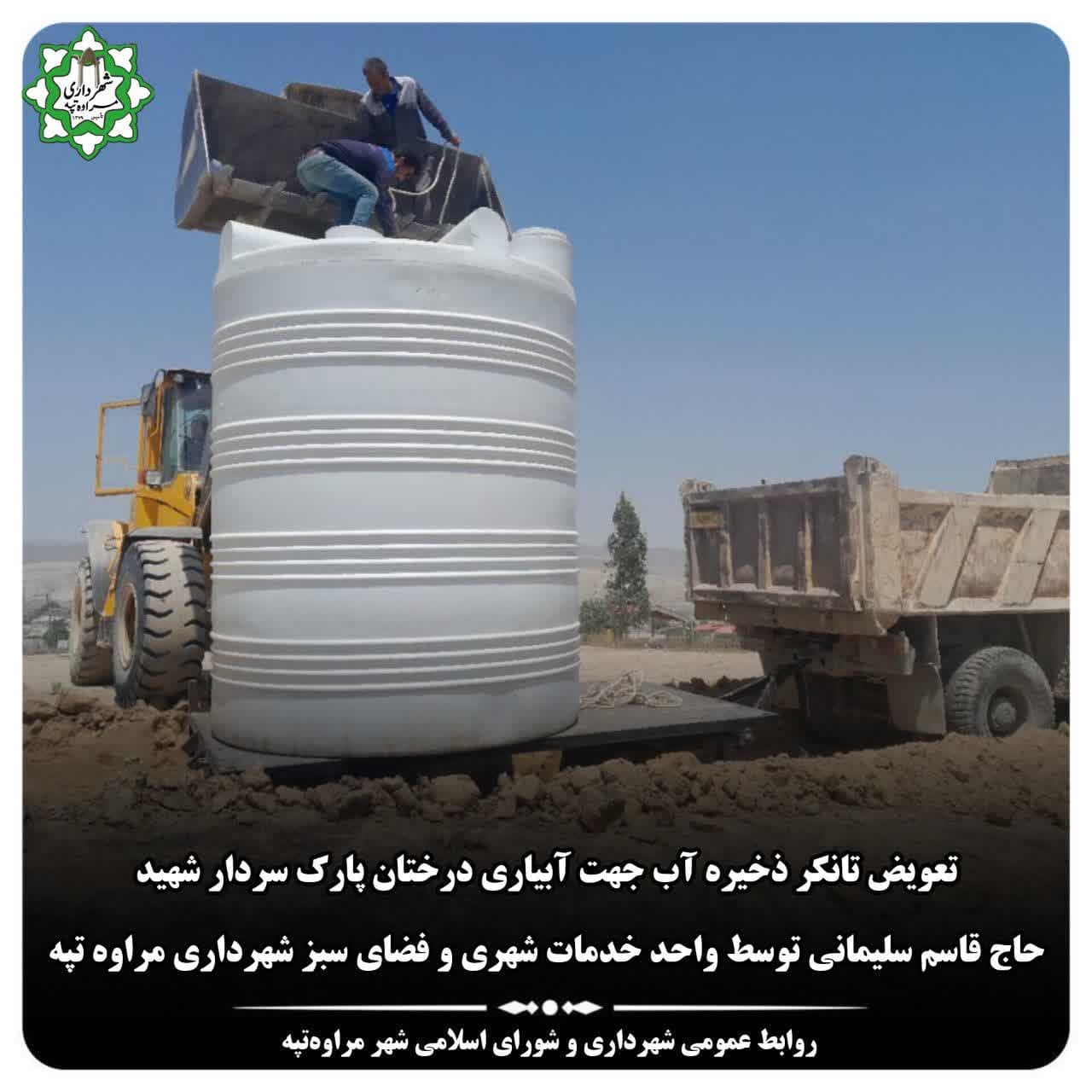 🔻تعویض تانکر فرسوده با تانکر جدید ۲۴۰۰۰ لیتری جهت ذخیره آب برای آبیاری درختان و فضای سبز پارک سردار شهید حاج قاسم سلیمانی توسط واحد خدمات شهری و فضای سبز شهرداری مراوه تپه