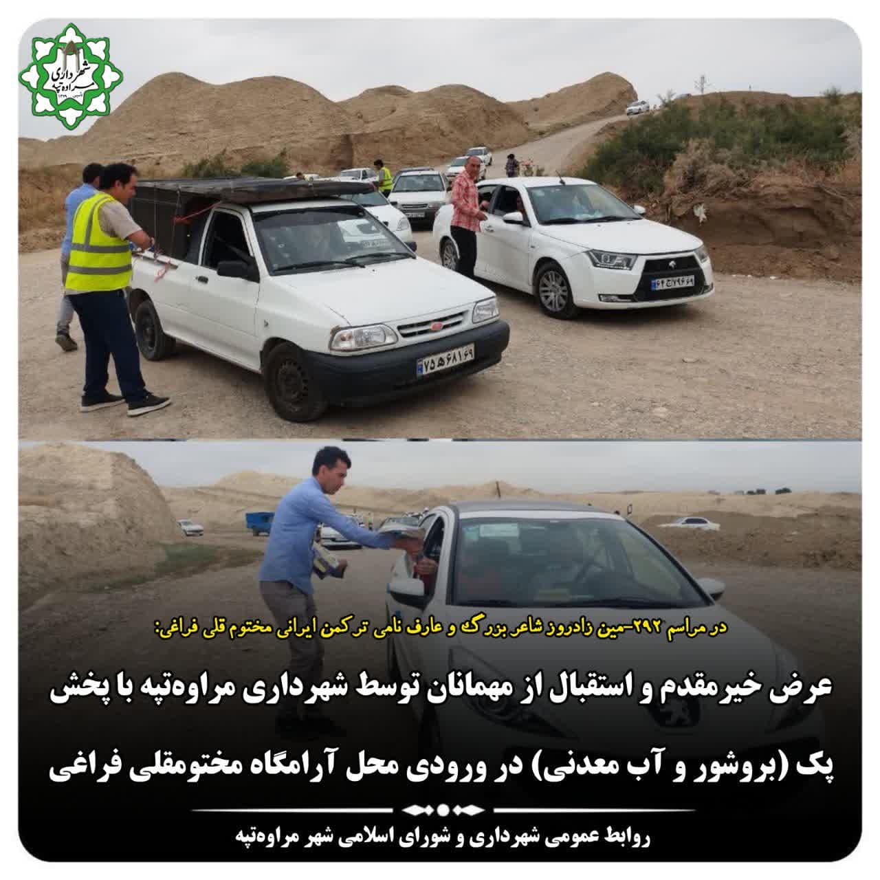 🔻عرض خیرمقدم به مهمانان در مراسم نکوداشت ۲۹۲-مین زادروز شاعر بزرگ و عارف نامی ترکمن ایرانی مختوم قلی فراغی در مسیر ورودی آرامگاه با پخش پک (بروشور و آب معدنی)توسط واحد روابط عمومی شهرداری و شورای اسلامی شهر مراوهتپه