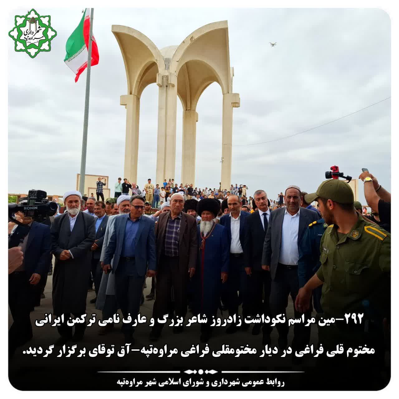 🔹به گزارش روابط عمومی شهرداری وشورای اسلامی شهر مراوهتپه، مراسم نکوداشت دویست و نود و دومین زادروز مختومقلی فراغی، شاعر شهیر ترکمن ایرانی عصر پنجشنبه ۲۵ اردیبهشت در آرامگاه این شاعر شهیر و بزرگ ترکمن در شهرستان مراوهتپه-آق توقای برگزار شد.