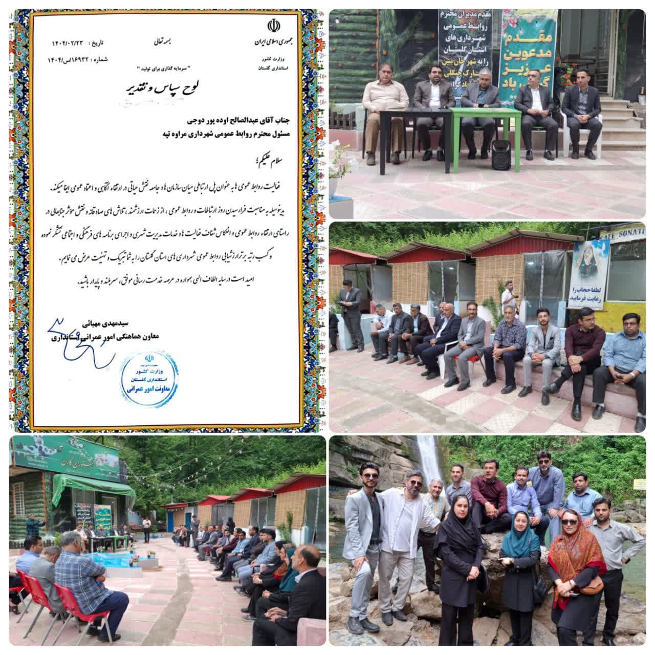 در مراسم تجلیل که با حضور مهندس کاظمی سرپرست محترم دفتر امور شهری و شوراهای استانداری و کارشناسان دفتر شهری ، سایر مسئولین و مدیران روابط عمومی شهرداری های استان برگزار شد، با اهدای لوح تقدیر از تلاشها و فعالیتهای اثربخش آقای عبدالصالح اوده پور دوجی مسئول روابط عمومی شهرداری و شورای اسلامی شهر مراوهتپه تقدیر و تجلیل به عمل آمد.