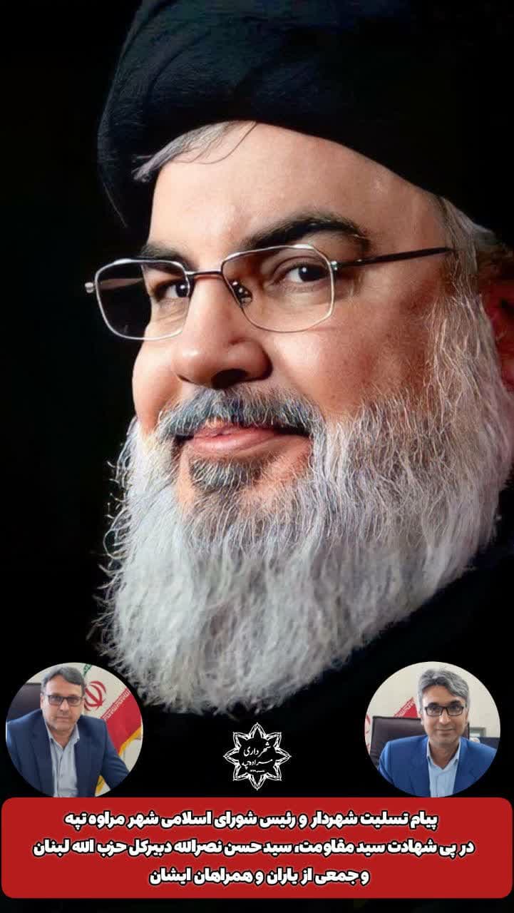 🏴پیام تسلیت شهردار و رئیس شورای اسلامی شهر مراوه تپه در پی شهادت سید حسن نصرالله دبیرکل حزب الله لبنان و جمعی از یاران و همراهان ایشان