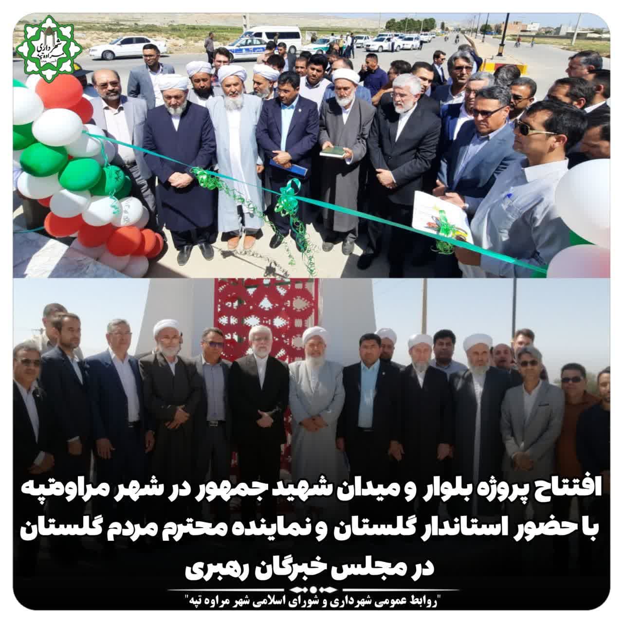 پروژه بلوار و میدان شهید جمهور در ورودی غرب شهر مراوه تپه با اعتباری بالغ بر هشت میلیارد تومان از محل اعتبارات منابع داخلی شهرداری با حضور جناب دکتر زنگانه استاندار گلستان و الحاج کمال آخوند غراوی نماینده محترم مردم گلستان در مجلس خبرگان رهبری ،افتتاح و مورد بهره برداری قرار گرفت.