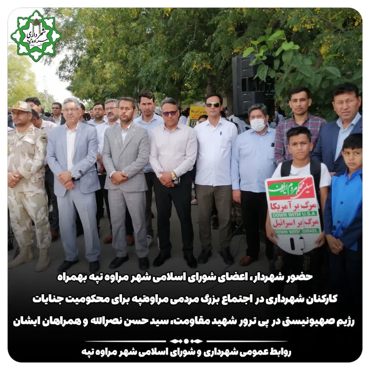 🏴حضور شهردار و اعضای شورای اسلامی شهر مراوه تپه بهمراه کارکنان شهرداری در اجتماع بزرگ مردمی مراوهتپه برای محکومیت جنایات رژیم صهیونیستی در پی ترور شهید مقاومت، سید حسن نصرالله دبیرکل حزب الله لبنان و همراهان شهید ایشان