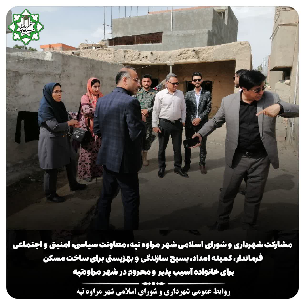 🔻امروز هشتم مهرماه، جناب آقای سیفی معاونت سیاسی امنیتی و اجتماعی فرماندار، مهندس جلال الدین حاجیلی دوجی شهردار مراوه تپه،عبدالصالح اوده پور دوجی مشاور شهردار در امور اجتماعی و فرهنگی، خسروی رئیس محترم کمیته امداد امام خمینی، سرکار خانم قلیچی رئیس محترم بهزیستی و نماینده بسیج سازندگی از منزل مسکونی خانواده کم برخوردار و آسیب پذیر در شهر مراوهتپه بازدید نمودند. در نتیجه این بازدید مقرر گردید شهرداری و شورای اسلامی شهر مراوه تپه بهمراه ادارات فوق الذکر در کار جهادی ساخت منزل مسکونی برای این خانواده که دارای چند فرزند و شرایط منزل مسکونی نامساعدی دارند، مشارکت نمایند.